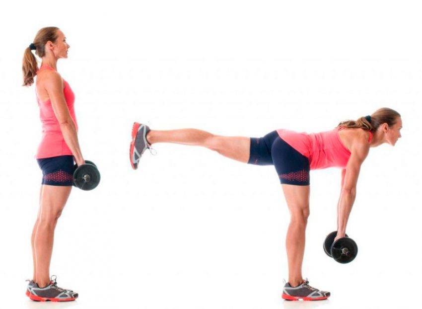 - Румынская тяга с гантелями на одной ноге. Позволяет перенести акцент на ягодицы, за счет того, что выполняется с акцентом на разгибание бедра не опорной ноги