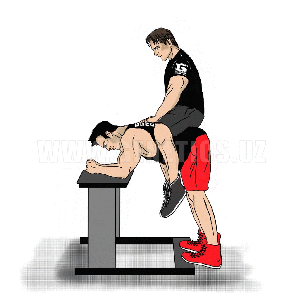 После того как спортсмен займёт правильное исходное положение, на него сверху усаживается ассистент. Его функция – обеспечение дополнительного отягощения.