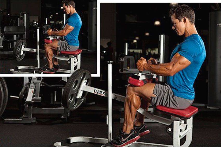 Подъёмы на носки сидя — это единственное упражнение, где нужно сгибать ноги в коленях. Упражнение выполняется на специальном тренажёре или с помощью штанги, лежащей на бёдрах ближе к коленям. Атлет при этом сидит и его ноги согнуты. Под штангу необходимо подложить что-либо мягкое. Если Вы решили пользоваться специальным тренажёром, то отрегулируйте высоту упоров под себя. Упритесь коленями в упоры или положите штангу над коленями так, чтобы Вам было удобно.