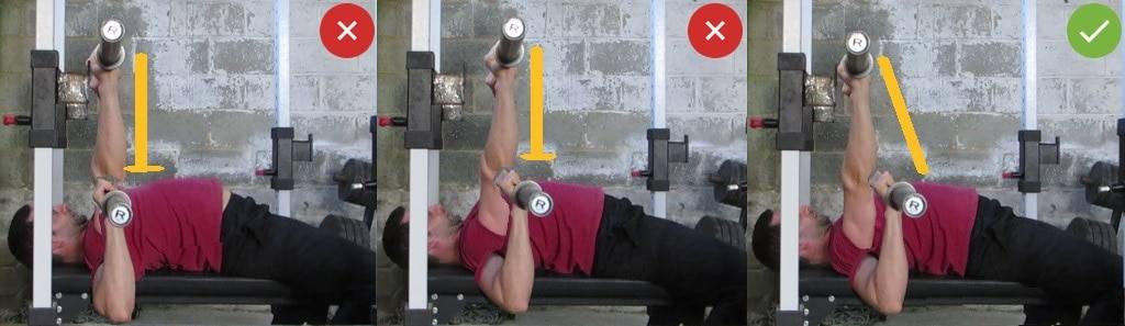 Не вертикальная траектория. В отличии от приседа и становой тяги, вертикальная траектория движения штанги не работает и не приветствуется в жиме лежа. Если вы поднимаете штангу строго вертикально это заставляет ваши локти разводиться на 90. Это травмирует плечи и усложняет выполнение упражнения. Самый безопасный и эффективные способы сделать жим лежа – соблюдать диагональную траекторию положения над плечами до середины груди и обратно.