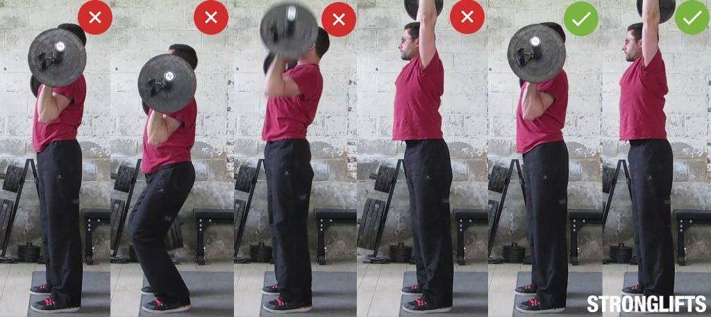 - Раскачка корпуса не допускается. Многие советуют делать полушвунг, то есть разгонять вес на старте ногами. Вместо этого лучше выбирать адекватные веса, и не рисковать здоровьем плеч;