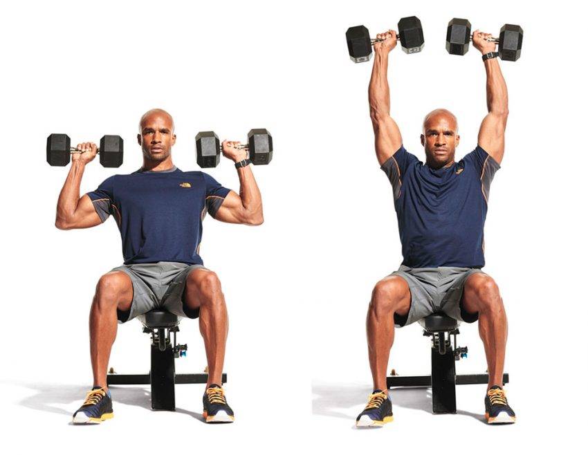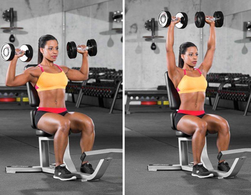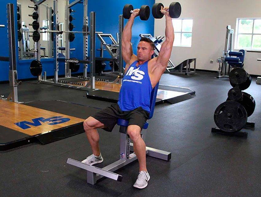 Обычно атлеты склонны задерживать его, когда тяжело. Это не правильно и может даже привести к потере сознания при подъеме гантелей над головой. Жим гантелей сидя подчиняется обычному правилу – выдох происходит на усилие, вдох – на опускании снарядов.