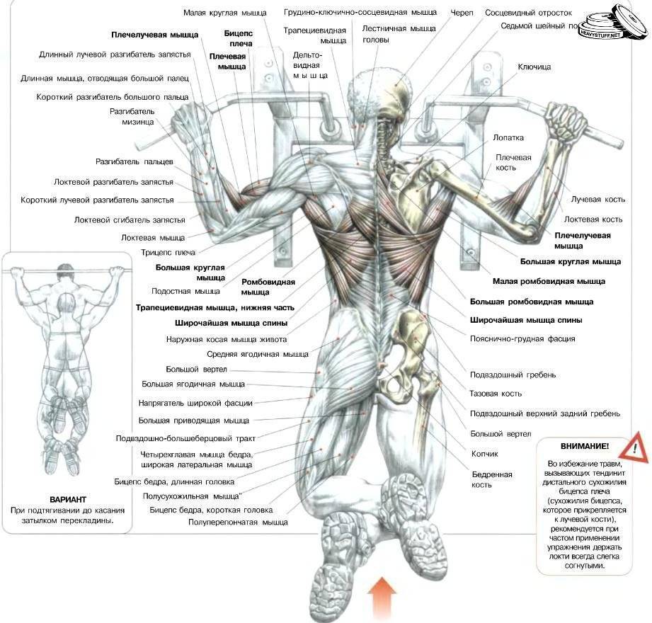 При выполнении такого вида подтягиваний прокачивается трапеция, парные круглые спинные мышцы и широчайшие мышцы спины.