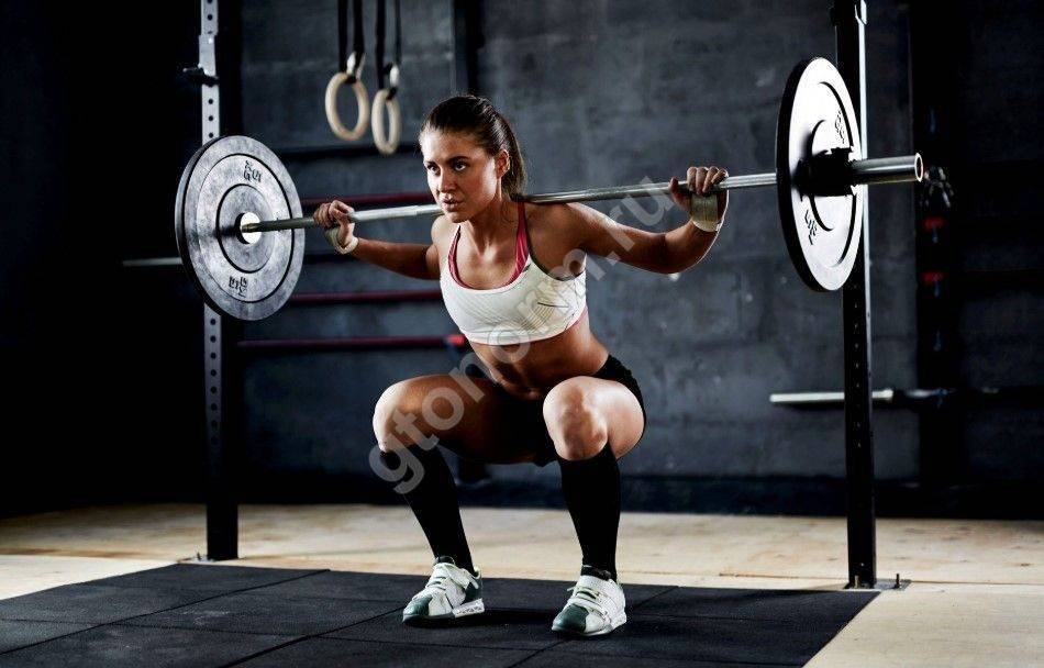 Исходное положение для большинства видов приседаний со штангой для мужчин и женщин одинаковое: ноги на ширине плеч, руки на грифе, локти отведены назад, спина прямая, лопатки сведены, пресс напряжен, взгляд вперед.