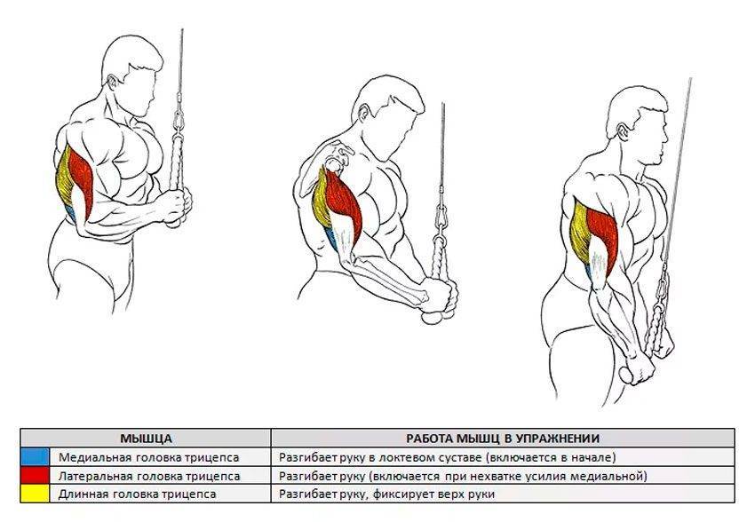 При правильном выполнении упражнения, помимо трицепсов в работу не должны включаться другие мышцы. Исключение составляют только работающие в статике стабилизаторы корпуса и, собственно кисти, которыми вы держите рукоятку. Если вы чувствуете, что у вас активно работает какая-то иная группа мышц – вы делаете упражнение неверно.
