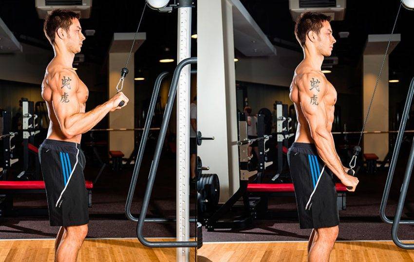 - Из положения «руки согнуты» опустите вес вниз усилием трицепсов. Локти не должны расходиться в стороны, они все время прижаты к корпусу.