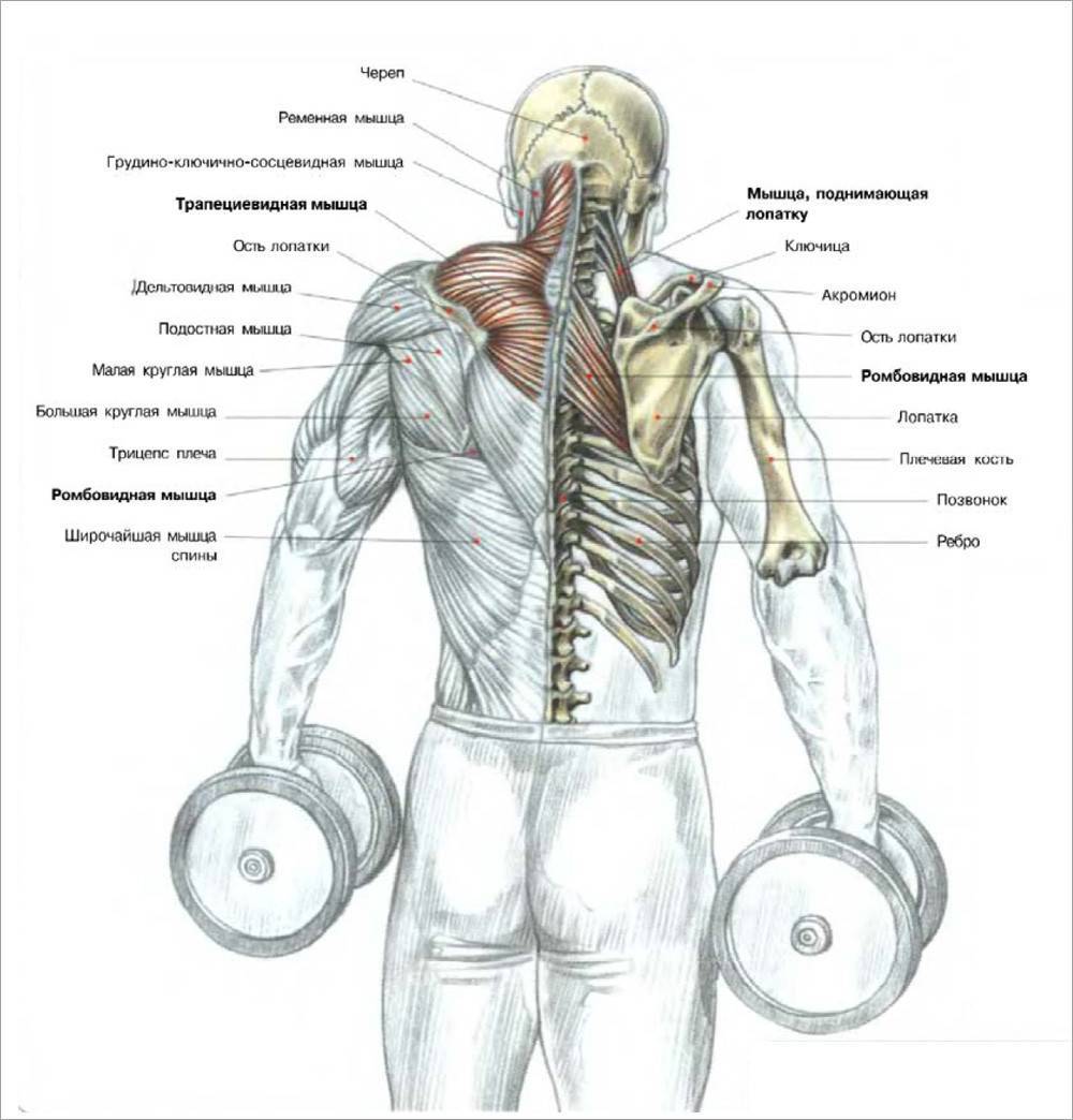 Дополнительно нагрузку получает ромбовидная мышца и мышца, поднимающая лопатку. Обе эти мышечные группы расположены под трапецией, и, хоть и имеют небольшие размеры, но эффективно помогают при выполнении некоторых упражнений.