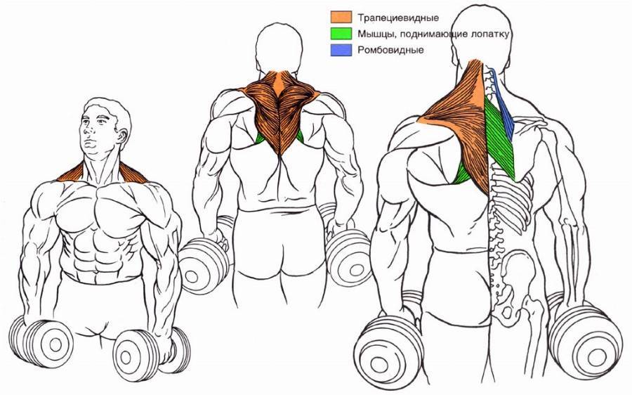 Выполняя шраги, большую нагрузку принимает верхний отдел трапециевидной мышцы. Также при работе включаются ромбовидные мышцы, а дополнительная нагрузка переходит на мышечные группы, которые идут в роли стабилизатора, такие как дельтовидная мышца и предплечья.