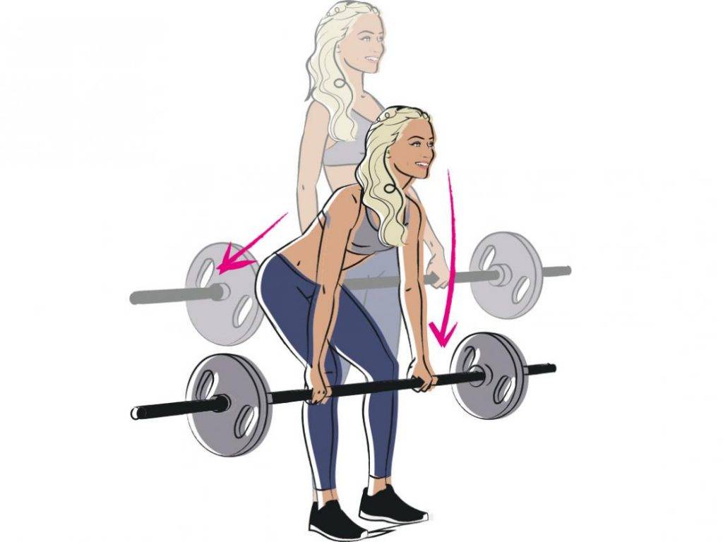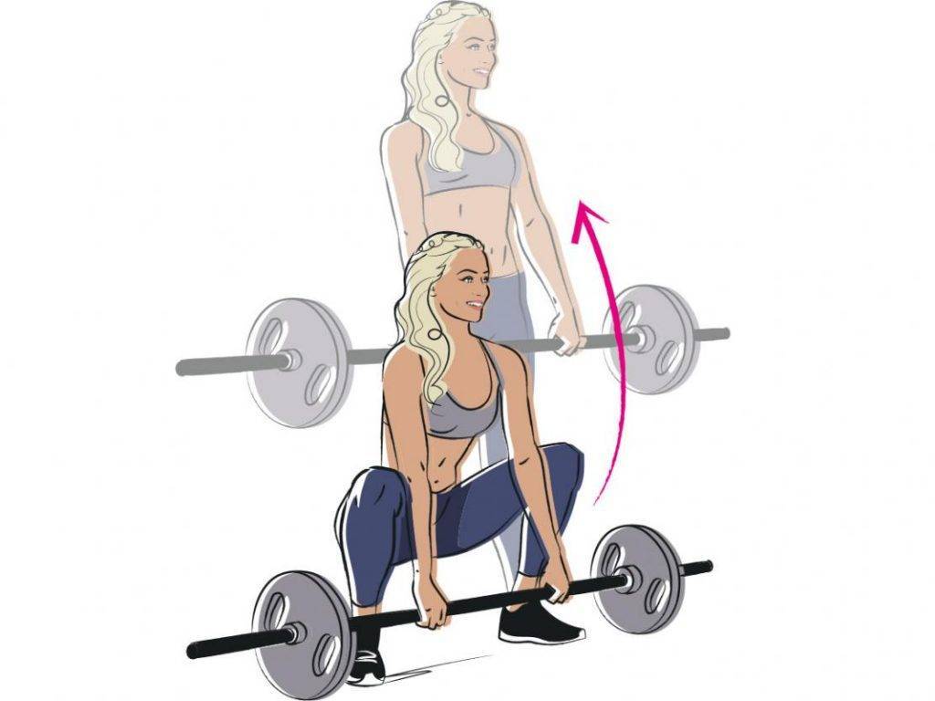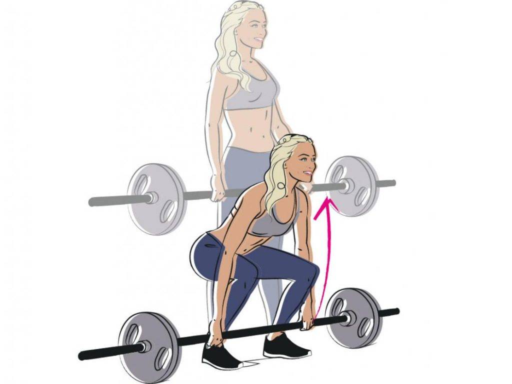- Перед тем как наклониться, дотроньтесь голенями до штанги, напрягите трапеции и поднимите гриф одним быстрым движением.