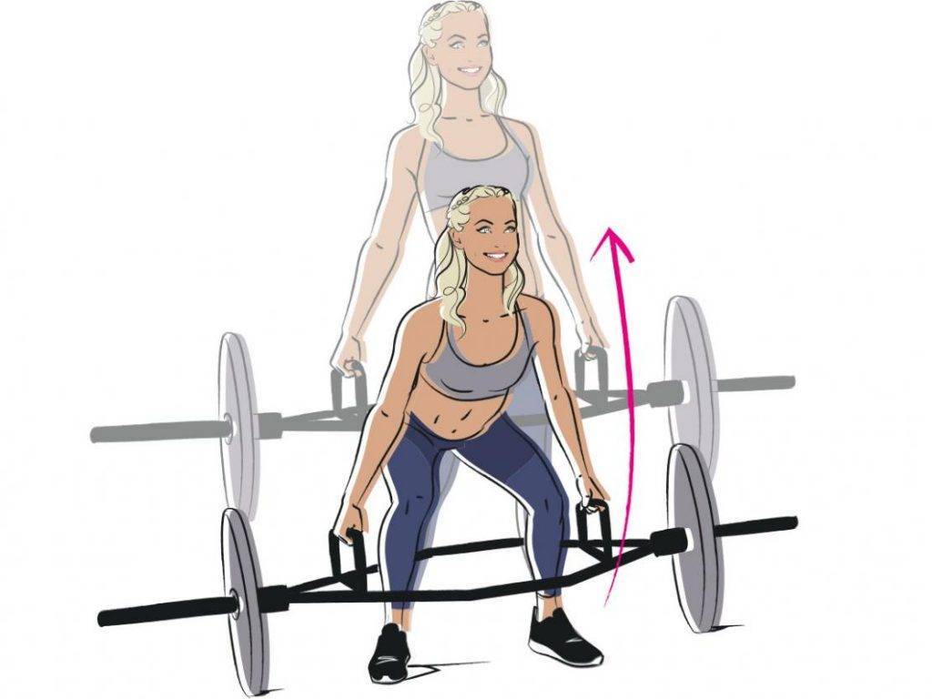 Тем, кто посильнее или имеет доступ к трэп-грифу, я рекомендую начать с этого варианта упражнения. Этот гриф специально разработан для того, чтобы позволить вам встать в центр тяжести, что механически облегчает подъем веса. Большинство трэп-грифов выпускается со специальными ручками для подъема штанги. Это огромное преимущество для тех, у кого есть ограничения в подвижности. Кроме того, вам не придется сильно наклоняться, чтобы поднять штангу. Такой гриф позволяет значительно легче сохранять нейтральное положение позвоночника на протяжении всего упражнения.