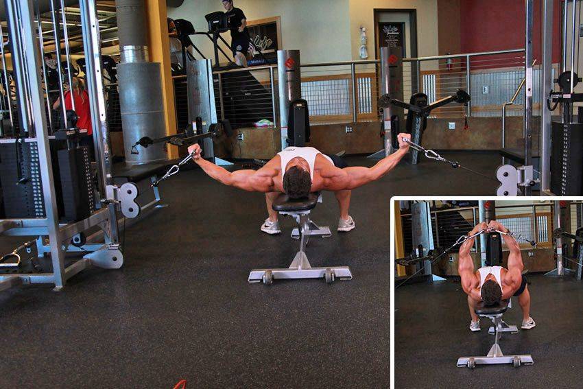 Сведение рук в кроссовере лежа на скамье выполняется следующим образом: