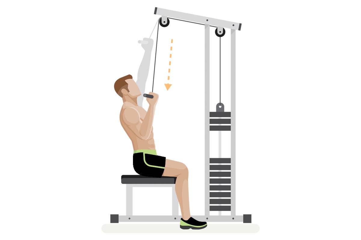 Тяга верхнего блокаЗа счет использования дополнительного веса позволяет выполнять аналогичное подтягиванием движение — но с большей отдачей. Использование различных рукояток и хватов позволяет модифицировать упражнение и задействовать различные мышцы спины. 3-4 подхода по 7-10 повторений |