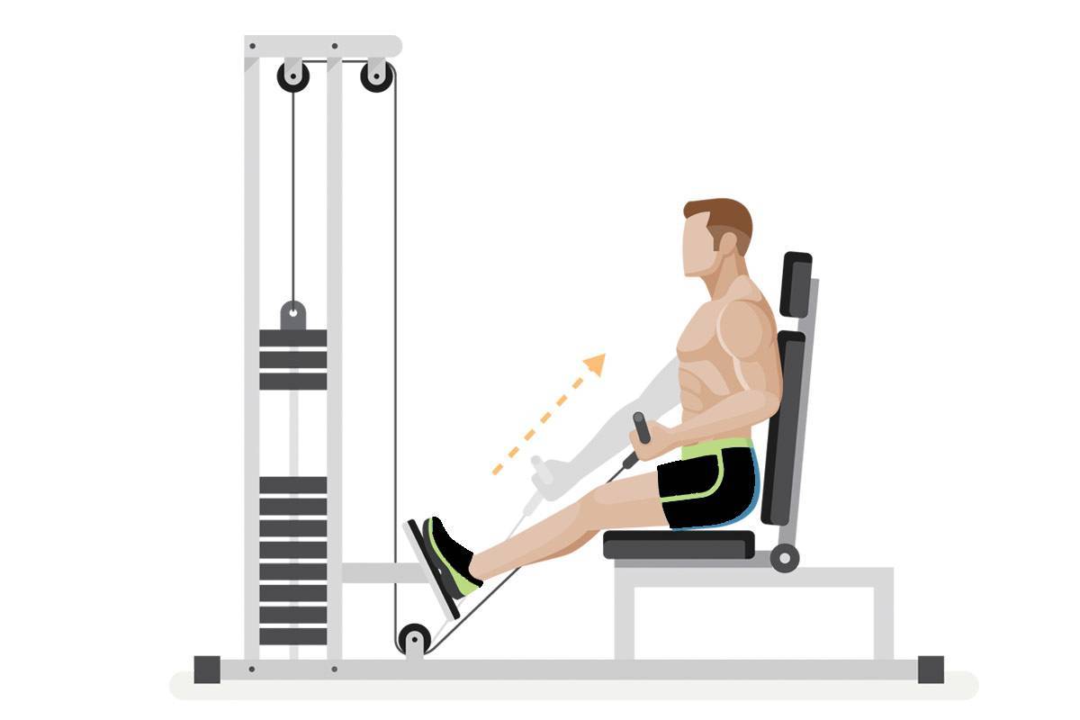 Разгибание голени сидя. Сесть на тренажер, взявшись за рукоятку, пятки должны выступать за края платформы. Совершать сгибания и разгибания ног, при этом нагрузка должна быть на икры, а не на бедра