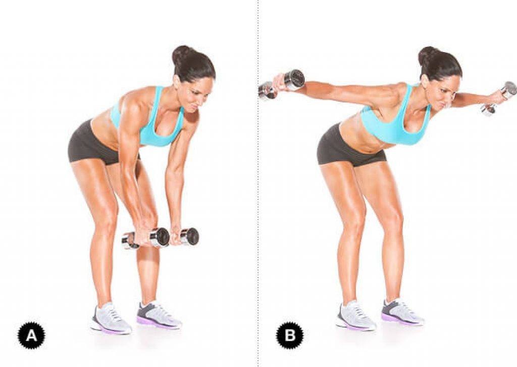 - потяните гантели в себе, в верхней точке сжимая лопатки