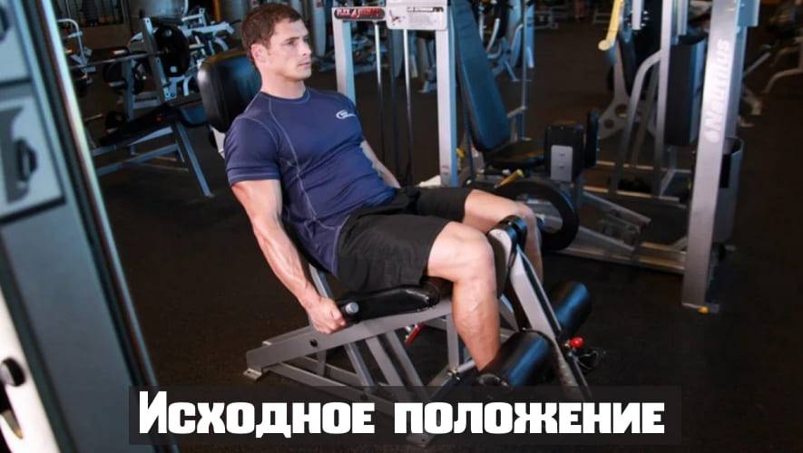 - Правильное исходное положение – спина опирается на спинку, бедро лежит на сиденье, голень зафиксирована подушкой тренажера, а угол между голенью и бедром составляет не более 90 градусов;